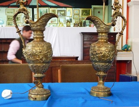 Pair brass Renaissance style ewer table lamps, with cherub and putti decoration