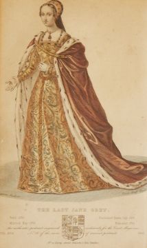 Four coloured engravings, "The Empress Marie Therese", "Lady Jane Grey", "Christina of Pisa" and "Valentine of Milan" and a Baxter print of two Spanish ladies