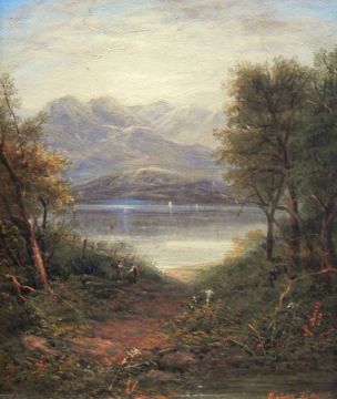 Edwin Buttery Oil on canvas Autumnal lakeside scene with figures in foreground, signed, 29cm x 24cm