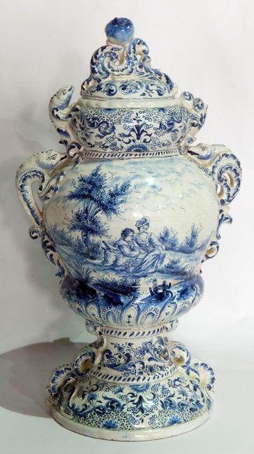 19th century Dutch delft covered vase, the cover with fruit and scroll surmount, having fish and scroll handles to the inverse baluster body, painted with couple in garden to one side, sailing boats to the other, on ornate relief scroll decorated circular feet, 58cm high