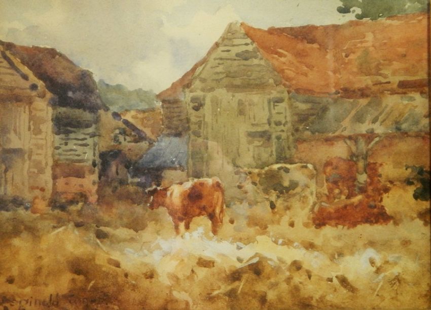 Reginald Jones (20th century) Watercolour Cattle beside farm buildings, 21 x 29cm, and a wooded landscape, 36 x 25cm