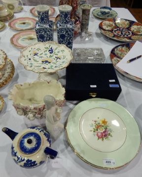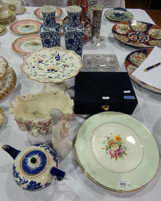 Pair Chinese porcelain blue and white vases, square and shouldered, Coalport "Pageant" pattern comport, cut glass rectangular box and cover, boxed pair Japanese china cabinet cups and saucers and other ceramics