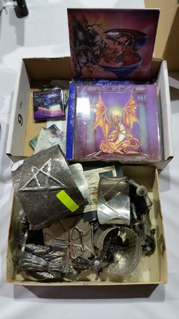 Quanity of decorative ceramic tiles with designs by Peter Pracownik, arm cuff made from off-cuts of armour from the film "Clash of the Titans" by Terry English, quantity of other jewellery and collectables