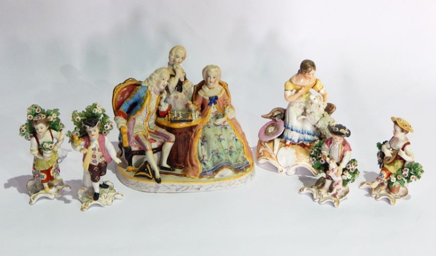 Set of four porcelain miniature figures of children with animals and flowers, 19th century figure of girl with chip-coated dog, a Continental bisque group of three figures and chess board
