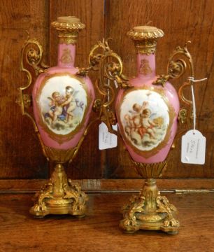 Pair ormolu mounted Sevres style lamp bases, each shouldered and tapering, pink porcelain ground painted with cherub and symbol panels, ormolu foliate scroll handles and foliate shaped square base (af)