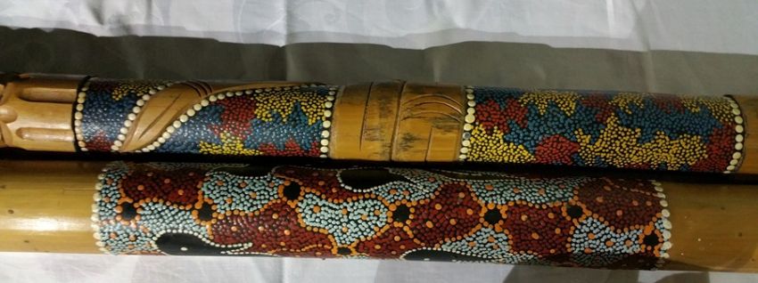 A didgeridoo carved with snake entwined with tribal decoration together with a rain stick with tribal decoration (2)