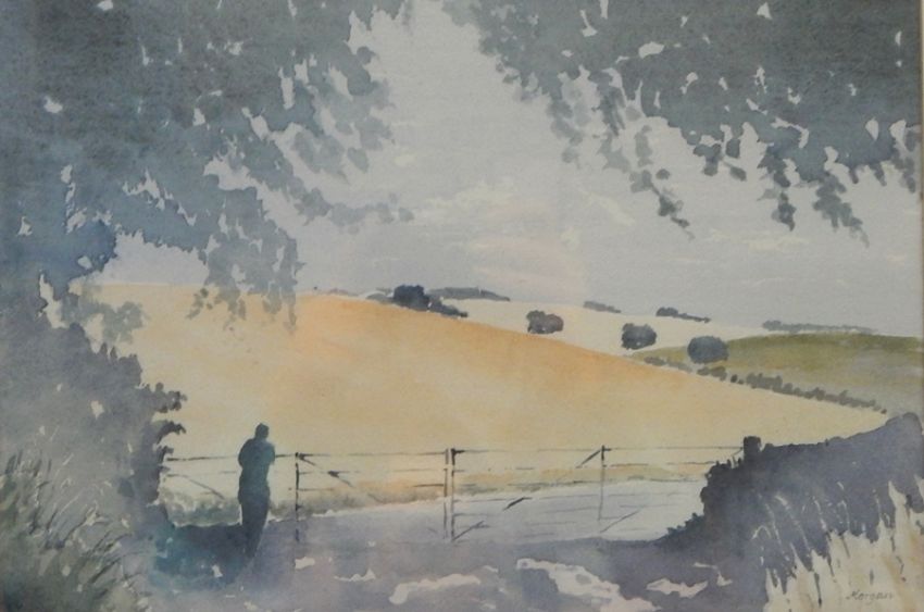 Morgan Hughes Watercolour Gloucestershire landscape, figure looking over a gate into the fields and surrounding hills, signed, 32cm x 22cm Frans Huys Print French ship Galere et Nef de Bande, 22cm x 29cm Golfing colour print "St Andrews - The Old Course" (3) Live Bidding: If you would like a condition report on this lot, please contact us at info@cotswoldauction.co.uk or 01242 256363