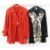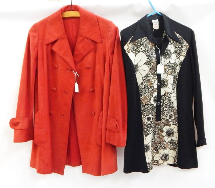 An emerald green Courtelle Correges style dress by Alexandra of Oslo, a red suede double-breasted three-quarter length jacket with pockets, half-belt, button detail, a 1960's sleeveless dress in pale blue by Svend Michelsen, a cream 70's style trouser suit and a Per Kragh design by Taco made in Denmark black and cream patterned trouser suit Live Bidding: If you would like a condition report on this lot, please contact us at info@cotswoldauction.co.uk or 01242 256363