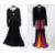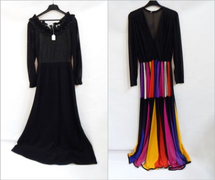 A 1960's Jean Allen black wool maxi dress with pierced wool sleeves, frill neckline and a 1970's black nylon evening dress with a black bodice, long sleeves and a multicoloured skirt (2) Live Bidding: If you would like a condition report on this lot, please contact us at info@cotswoldauction.co.uk or 01242 256363