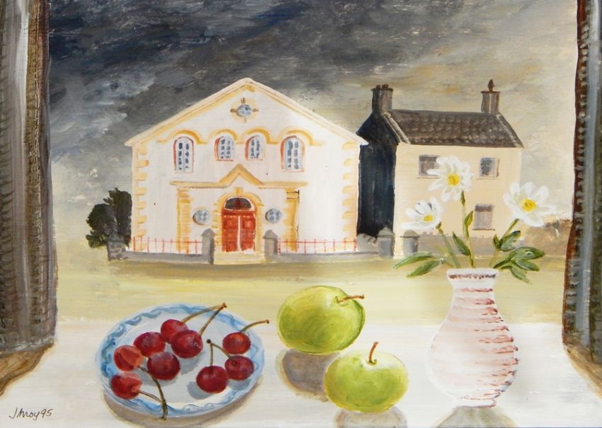Judith Moy Acrylic Fruit on windowsill with buildings across the road, labelled verso, 23cm x 28cm Live Bidding: If you would like a condition report on this lot, please contact us at info@cotswoldauction.co.uk or 01242 256363