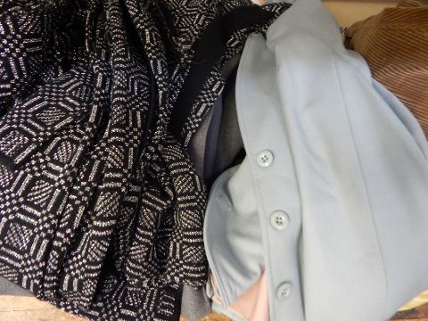 Two vintage Jaeger wool suits, various other ladies clothing and a 1970's long dress with matching jacket by Michael Lumley in black with silver thread (1 box)