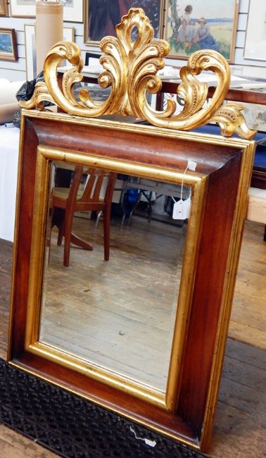 Contemporary oak and carved giltwood wall mirror, rectangular in rococo style with foliate scroll surmounting, 123cm high