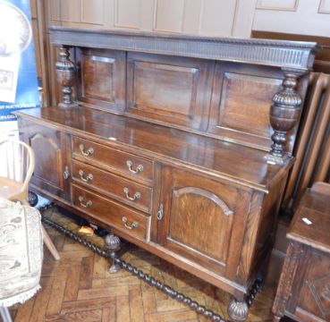 A Jacobean style oak sideboard, the fluted and fielded panel back with carved cut and colour supports, three central drawers flanked by cupboards enclosing shelf, on carved cut and colour supports united by turned spiral stretchers, 183cm