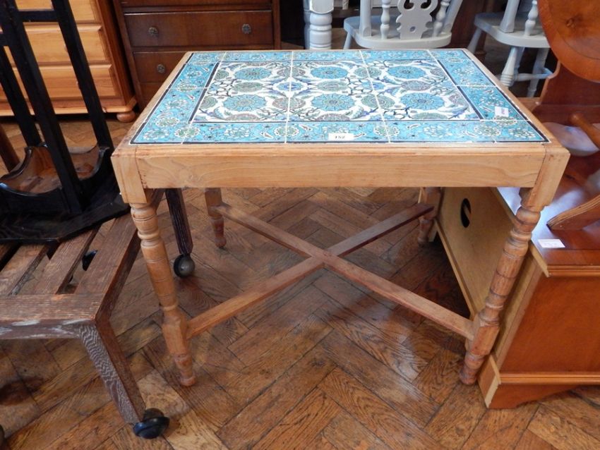 A coffee table with Isnic-style tiled top and turquoise edging, white inner section with floral decoration, on turned and block supports with bun feet and cross-stretchers