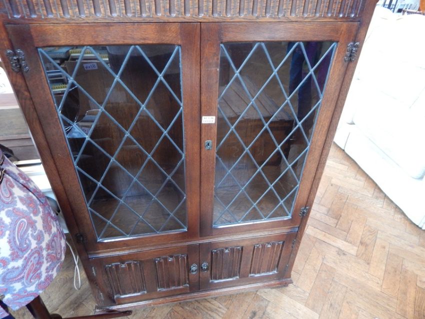 A reproduction cased oak bookcase, with pair of doors with leaded lights, enclosing shelf space, pair of cupboard doors below with linenfold carving, width 96cm, together with a mahogany cupboard with pair of panelled doors enclosing shelves on square legs with castors, width 48cm