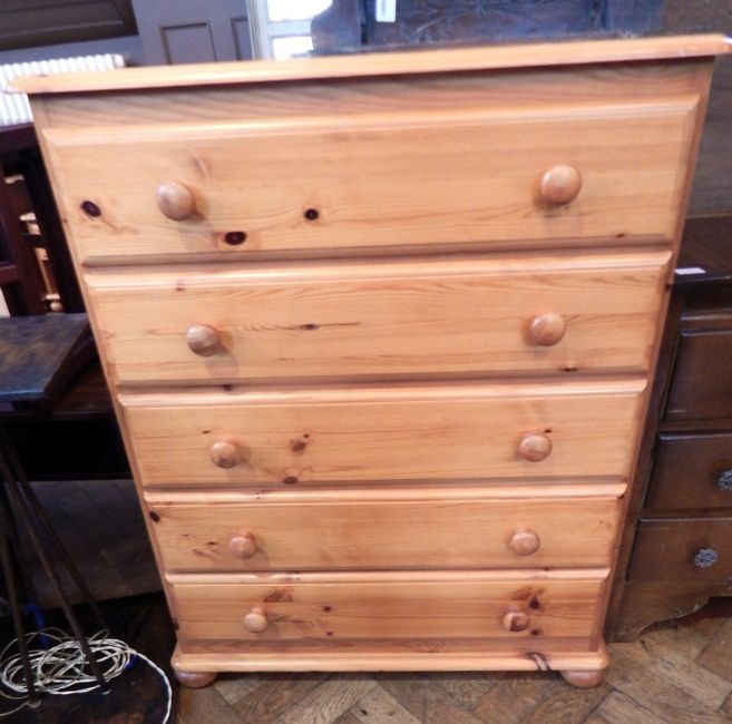 A pine chest of five long drawers, turned and bun feet, 80cm wide