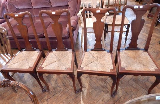 A set of four fiddle back dining chairs, with rush seats on cabriole legs with pad feet (4 singles)