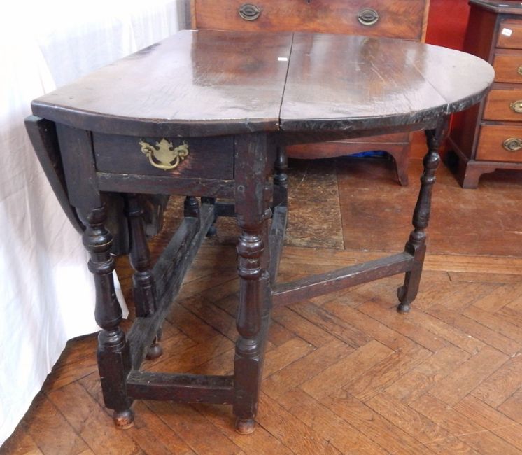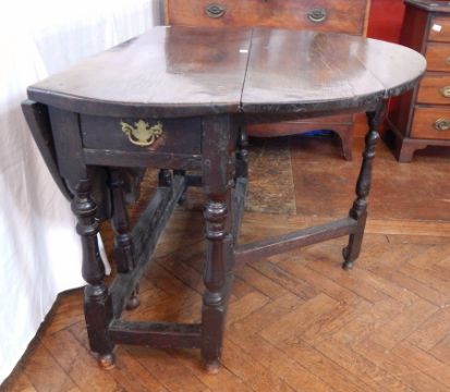 An 18th century oak oval top gateleg table, with a frieze drawer, on turned baluster legs united by stretchers, length 121cm