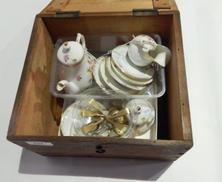Dolls continental china coffee set including coffee pot, covered sucrier and side plates, all stylised pink and white daisy decorated and dolls teaspoons in wooden box
