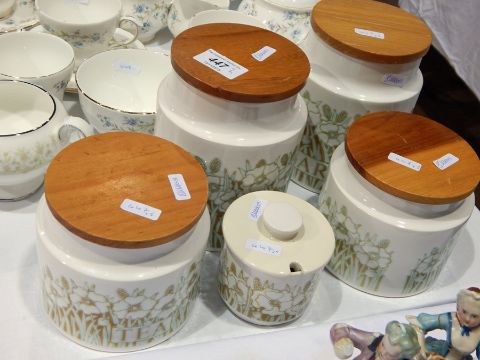 Set of four Hornsea pottery cylindrical kitchen canisters, "Fleur"$ pattern, lidded