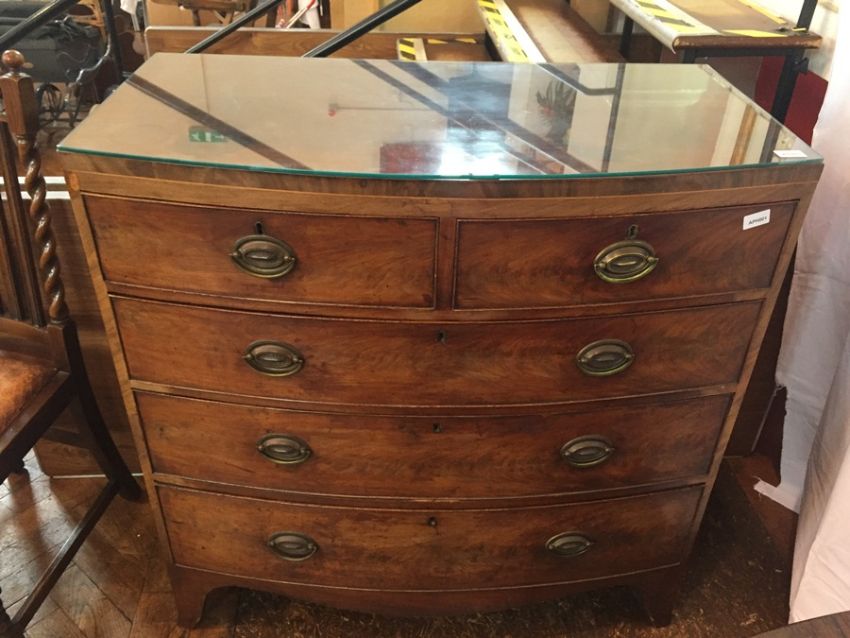 Late Georgian mahogany bow front chest of two short and three long graduated drawers on splayed bracket feet with loose glass top, width 100cm