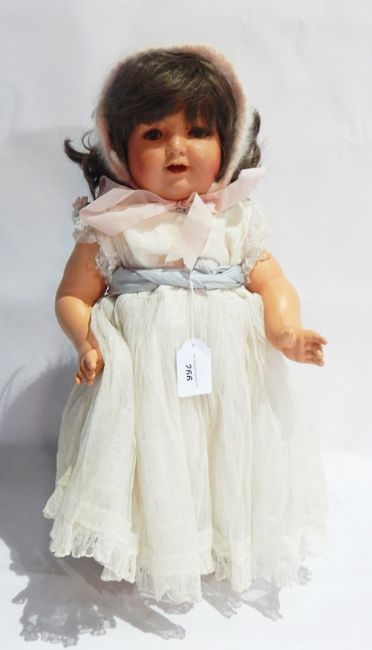 A mid 20th century French walking doll, circa 1936 to 1950, wearing cream dress and mohair bonnet, 55cm with clockwork type action