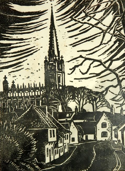 Maggie Davis Signed lino cut "St Mary the Virgin, Saffron Waldren", signed and dated '71, 28.5cm x 21cm