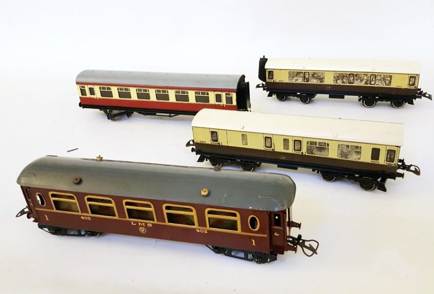 Three Hornby 'O' gauge passenger coaches and another by another maker