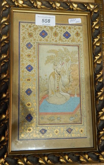 Indian/Persian painting of man in traditional dress at prayer with ornate gilt border, 21cm x 12cm and another, similar of figures in garden scene with falcon, gilt border, 29.5cm x 19.5cm
