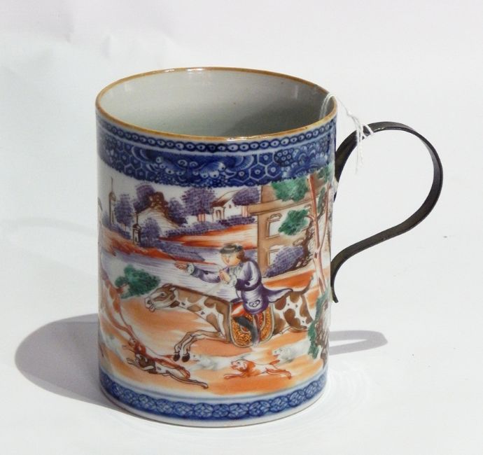 18th century Chinese porcelain mug decorated with huntsmen on horseback, in river landscape, blue brocade borders, having metal handle, 12cm high