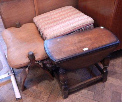 An oak oval flap top coffee table on turned legs, a camel saddle stool and an upholstered box stool (3)