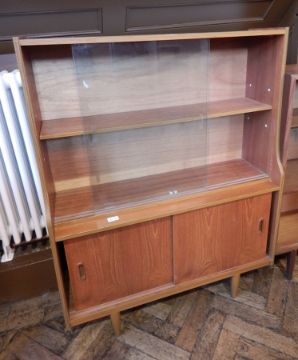 A circa 1960's bookcase with glass sliding doors, cupboard below, raised on turned tapering legs, width 91cm