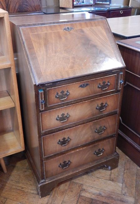 A reproduction mahogany bureau of small proportions, with fitted interior, four long drawers raised on bracket feet, width 50cm