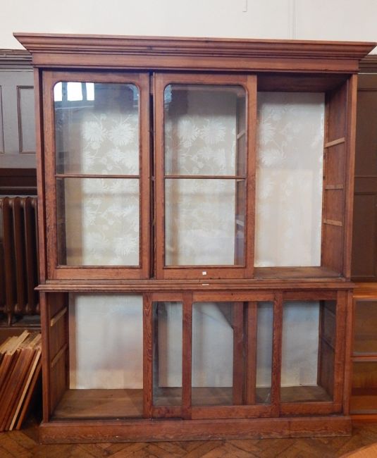 A Victorian pitch pine glazed bookcase with straight moulded corners, the top with pair glazed sliding panel doors flanking the central section of three open shelves, with further glazed cupboards below, raised on a plinth base, width 195cm