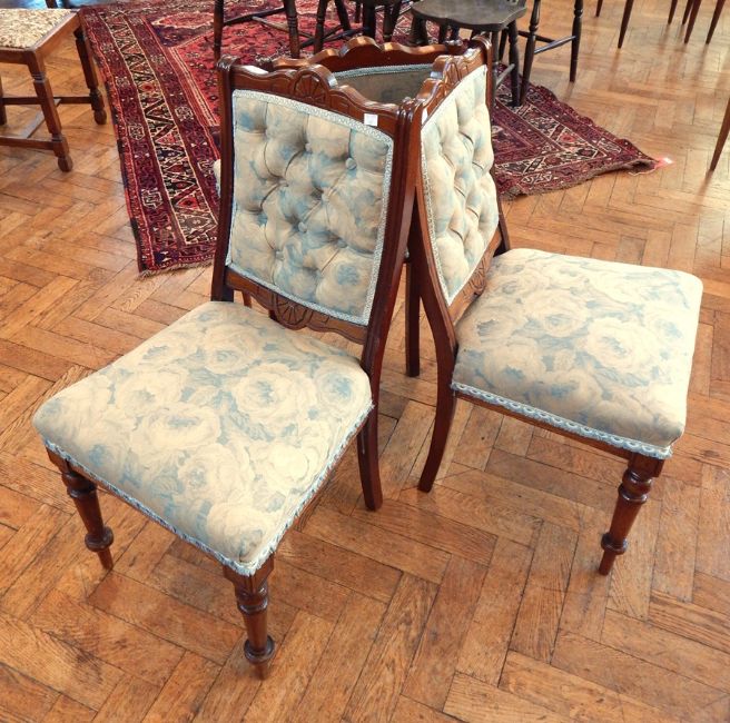 A set of three late Victorian walnut framed single chairs, with button panelled backs, stuffover seats, on turned tapering legs (3 singles)