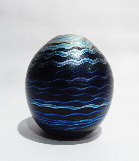 A Norman Stuart Clarke studio glass vase of ovoid form with iridescent brown, blue and silver wavy concentric circle decoration, engraved signature to base and initials "PBG85", 14cm high