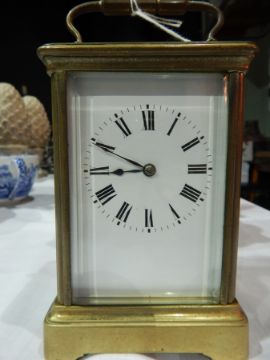 Early 20th century brass carriage clock, plain enamel dial, Roman numerals, having French gong striking movement, 18cm high overall