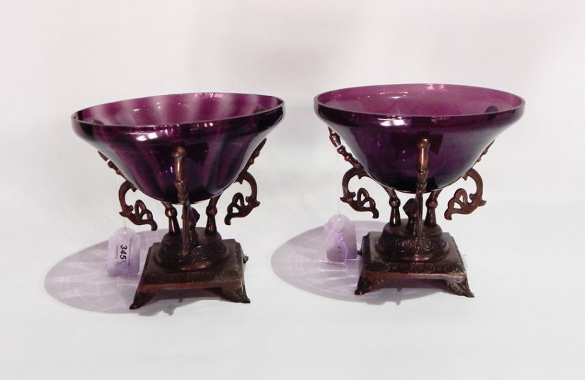 A pair of amethyst glass bowls on bronze-effect moulded stands, each of three scroll arms, on stepped square bases, 25cm diameter