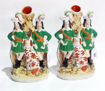 Two Staffordshire spaniel flatback spill vases, 33cm and 34cm and a pair of Staffordshire flatback spill vases, highland figures with spaniels, 31cm high