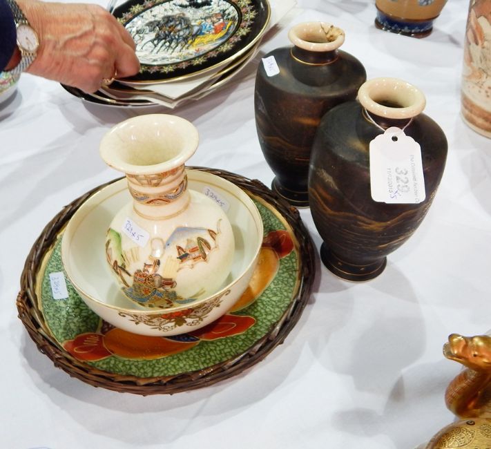 Noritake sugar basin, pair Japanese gilt on black pottery vases and two other Oriental ceramic items