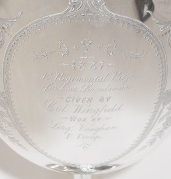Victorian silver regimental presentation goblet with bright cut engraving, on a raised circular beaded foot, "The SYC 1887 First Regimental Prize for the Best Swordsman given by Col. Wingfield and won by Sergt. Vaughan F Troop", London 1886, 18oz approx., height 29cm