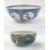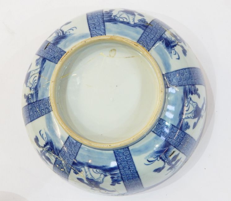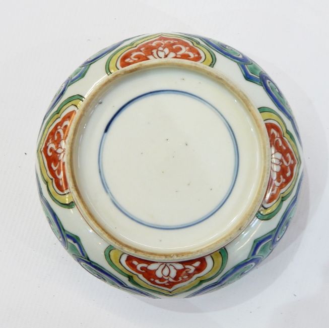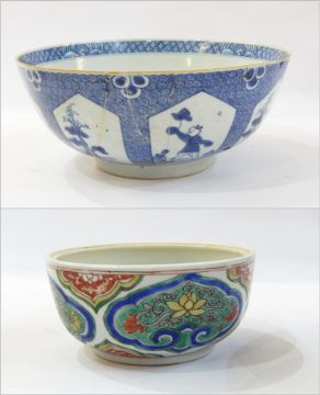 18th century Chinese blue and white bowl decorated with panels of boy holding flower and trees (af) and Chinese polychrome enamelled bowl, floral decorated in scroll patterns, 15cm diameter (lid missing)