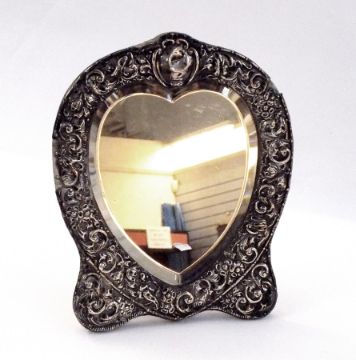 Victorian silver heart-shaped bevelled table mirror with foliate scrollwork design, Birmingham 1898, height 25cm