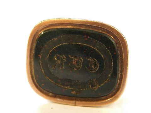 19th century gold-coloured metal and bloodstone seal with double scroll heart surmount