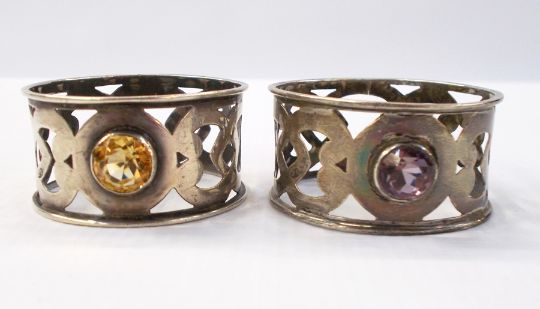 Pair of George V silver napkin rings of open fretwork design, inset with amethyst and citrine, Birmingham 1910