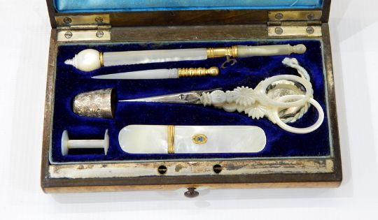 19th century bird's eye maple sewing casket with domed hinged lid having angular metal carrying handle, fitted interior with mother-of-pearl and gilt mounted implements, 23.5cm wide