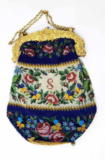 Victorian beaded purse, floral decorated and initial "S", having floral embossed gilt metal mounts and chain link handle