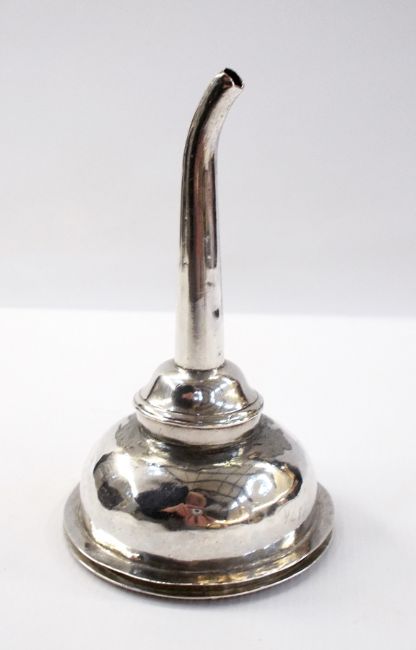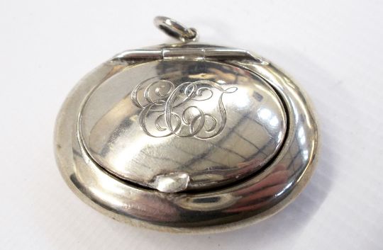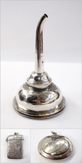 Edwardian silver vesta case with foliate engraving, Chester 1904, silver oval pillbox, Chester 1921 and Georgian silver plate wine funnel (3)