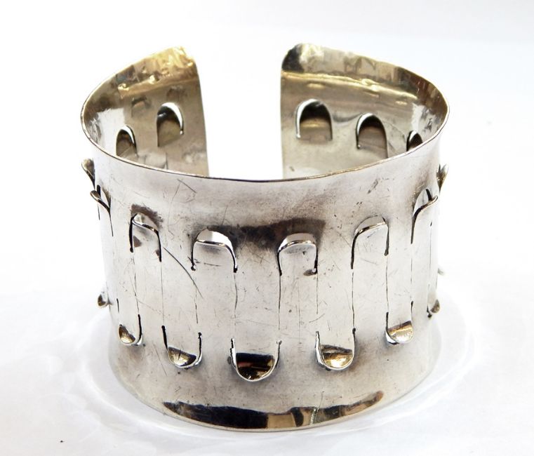 1960's designer silver-coloured metal open bangle by Maughan Harvey (silversmith and goldsmith who studied under George and Henry Hart, Chipping Camden, 1940's to 1980's), having curved sides with pierced panel decoration