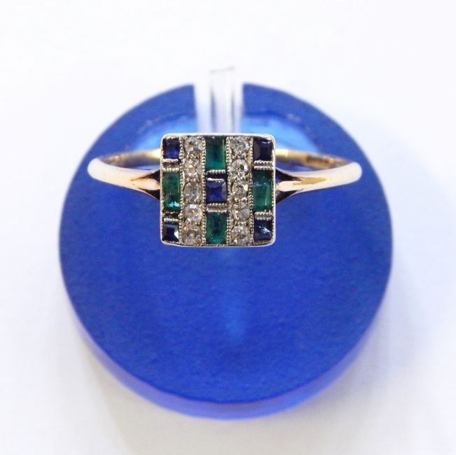 18ct gold, emerald, sapphire and diamond ring of Art Deco design, having two lines of five brilliant-cut diamonds flanked by square rectangular cut sapphire and diamonds, in illusion setting
